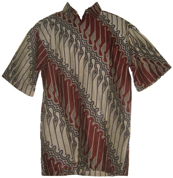 Kemeja batik lengan pendek warna merah dipadu dengan warna putih membuatnya terlihat elegan.